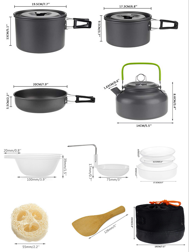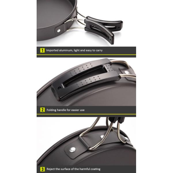 1. Lightweight: Our outdoor cookware set is made of the high quality aluminum alloy. Fast heating, lightweight and corrosion resistance. Durable for long time using.