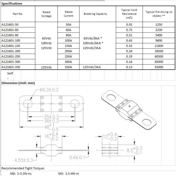 JULUN Electric Vehicle Fuse (Model Number: A121601 50~350A 125VDC) is a reliable product for automotive, motorcycles, power tools, ships, electrical equipment, industrial equipment and medical equipment. It has high-performance features that promote safety and efficiency. With CE UL CCC certification, it is 100% safe to use. It comes with a minimum order quantity of 100 and a price range of 3-6USD. It is packed in cartons for shipment and delivery time is 2-4 weeks. Payment terms are T-T, and the supply ability is 1000K/PCS. This fuse has a recommended tight torque of M6: 5-5.5N·m and M5: 3.5-4N·m, and it has a net weight of 15g. It is suitable for automobiles, batteries, electrical machinery, ships, motorcycles, equipment, and other products. JULUN Electric Vehicle Fuse is the perfect choice for automotive battery charger, DC electric car charging, CCS EV charger, and other electrical applications.