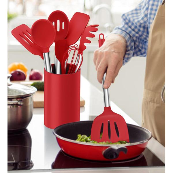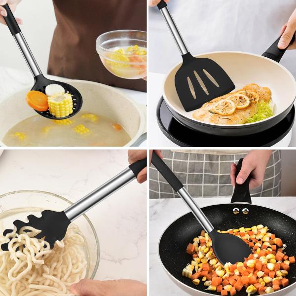 LARGE KITCHEN UTENSILS WITH STAINLESS HANDLE If you've grown tired of small kitchenware that resembles children's toys, this large kitchen tools set is perfect for you. The silicone head combined with the high-quality stainless steel handle ensures lightweight and durable for everyday use. The container is big enough to fit everything back in easily. Stainless steel handles are not only corrosive-proof but also do not need to worry about fading or wear