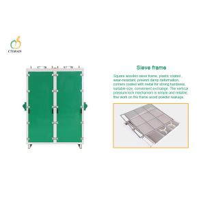 2. The square wooden screen frame is covered with plastic coating to make the screen frame wear-resistant and prevent moisture deformation. The edges and corners are wrapped with metal to enhance the hardness of the screen frame. The size of the screen frame is fixed to meet the standard and is easy for replacement. The locking mechanism adopts vertical pressure locking, which is simple and reliable. Through fine processing, the frame can effectively avoid the leakage of powder.