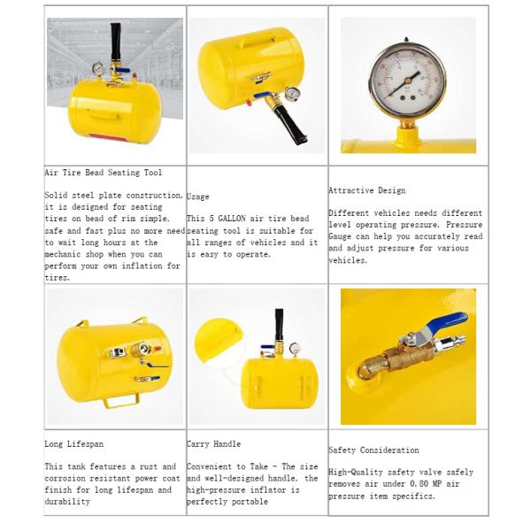 5-gallon air bead seater which is made of solid steel. There is an on/off valve that is designated for controlling the filling of the tank. There is also an air gauge exposed which tells you the air volume accurately. Our bead blaster is essential for your tire beading. It is suitable for heavy-duty vehicles such as trucks, ATV, tractor and so on.