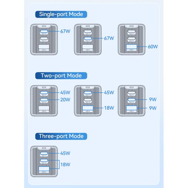 Output Voltage and Current | USB-C1: 5V/3A, 9V/3A, 12V/3A, 15V/3A, 20V/3.35A(67W Max); USB-C2: 5V/3A, 9V/3A, 12V/3A, 15V/3A, 20V/3.35A(67W Max); USB A: 5V/3A, 9V/3A, 12V/3A, 20V/3A(60W Max); USB-C1+C2: 45W+20W Max; USB-C2+USB A: 18W Max; USB-C1+USB-C2+USB-A: 65W+18W Max |