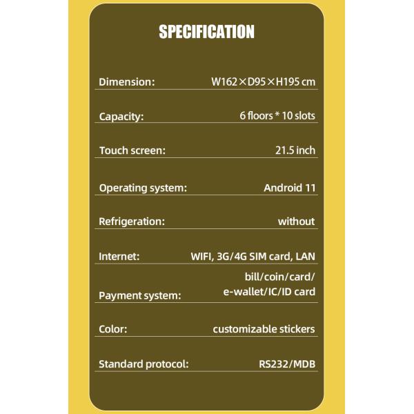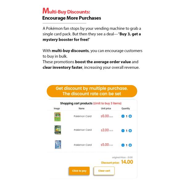 Catch fans’ attention with this eye-catching Pokémon vending machine! The 21.5-inch touchscreen displays vibrant product images, game trailers, and card details—just like a mini Pokémon store. From booster packs to plush toys, customers can browse, learn, and buy easily. Perfect for malls, game shops, and comic conventions, it helps you sell more while creating an exciting fan experience. Customizable stickers specially designed for our clients. Card/cash payment systems make it easy and conveinent to shop.